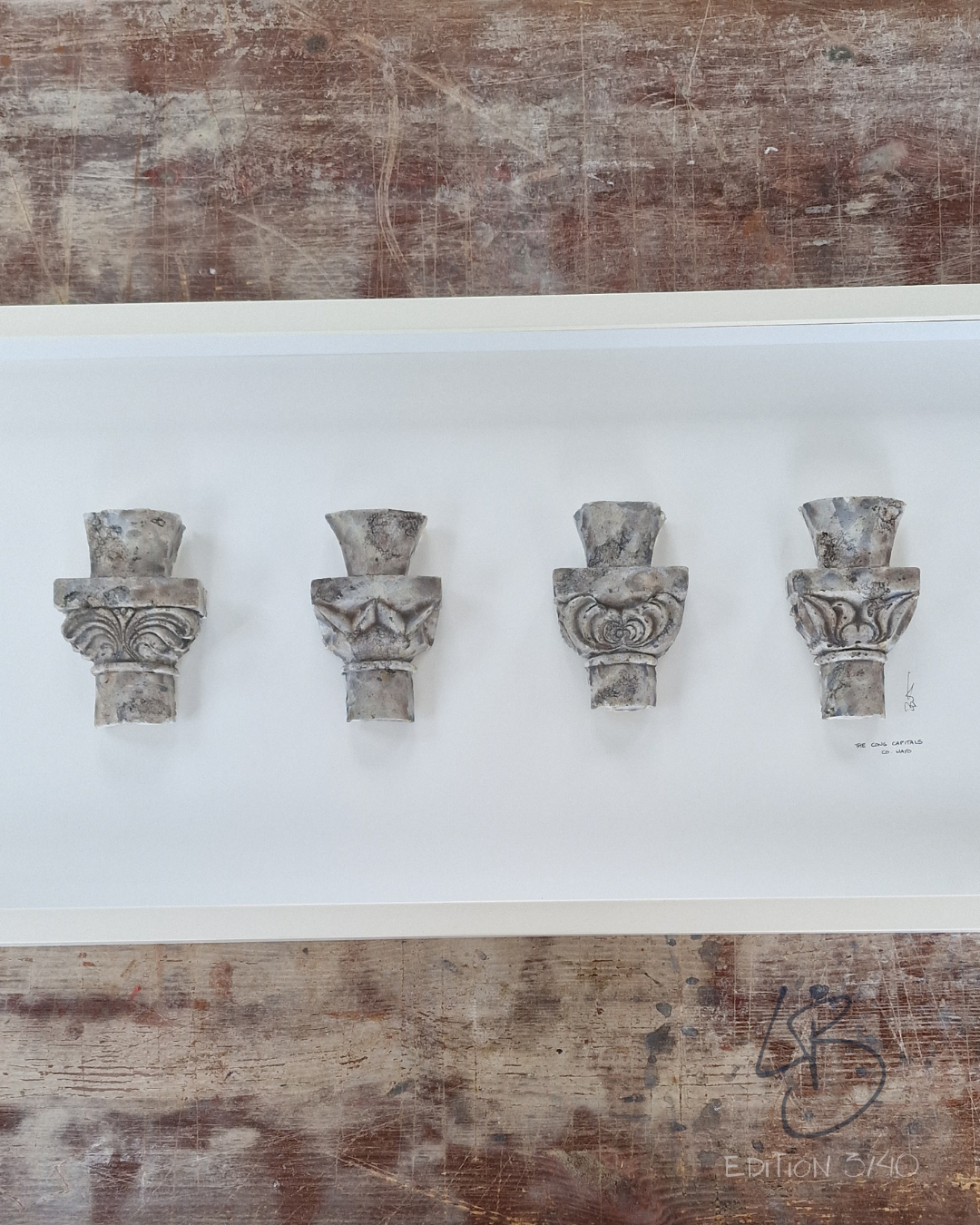 I wanted to highlight the detail in this work and these pieces were cast carefully to incorporate the crumbling texture and then painted to emphasise it. This is actually a real favourite of mine. The individual capitals have been available to purchase on my website, but I had framed these 4 together back in 2023 and never listed it here.
