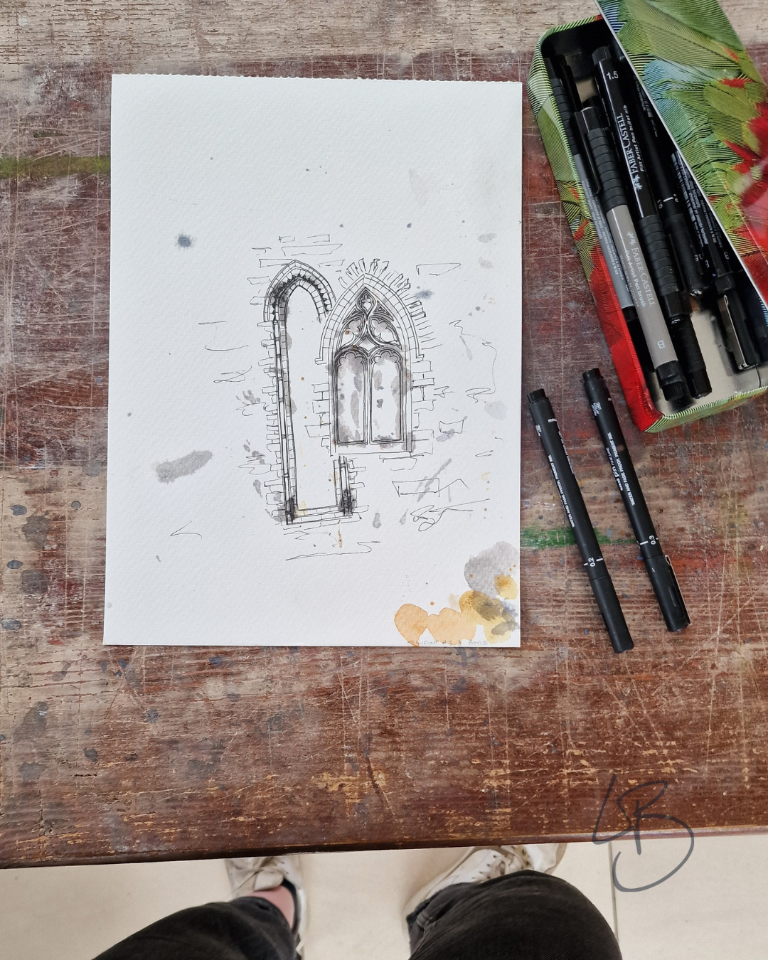 In this series I decided to explore that idea further. I drew the window outlines in fine liner directly over the Ghost, creating a visual connection between the sculpture and the drawing.